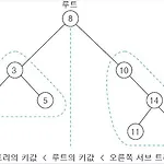 이진 탐색 트리(Binary Search Tree) - 정의 이진 탐색 트리는 탐색 작업을 효율적으로 하기 위한 자료구조입니다. 다음의 정의들을 가지고 있습니다. 모든 원소는 서로 다른 유일한 키를 가짐왼쪽 서브트리에 있는 원소들의 값은 그 루트의 값보다 작음오른쪽 서브트리에 있는 원소의 값들은 그 루트의 값보다 큼왼쪽 서브트리와 오른쪽 서브트리도 이진 탐색 트리임 왼쪽 서브트리 값 루트노드의 키 값 인 경우 : 루트 노드의 오른쪽 서브 트리에 대해서 탐색이런식으로 서브트리로 넘어가서 순환적으로 탐색을 반복하게 됩니다. 다음의 11이란 값을 찾는 연산을 그림으로 나타내면 다음과 같습니다.11을 루트 노드의 키 값 8과 비교 -> 오른쪽으로 이동11과 10을 비교 -> 오른쪽으로 이동11과 14를 비교 -..